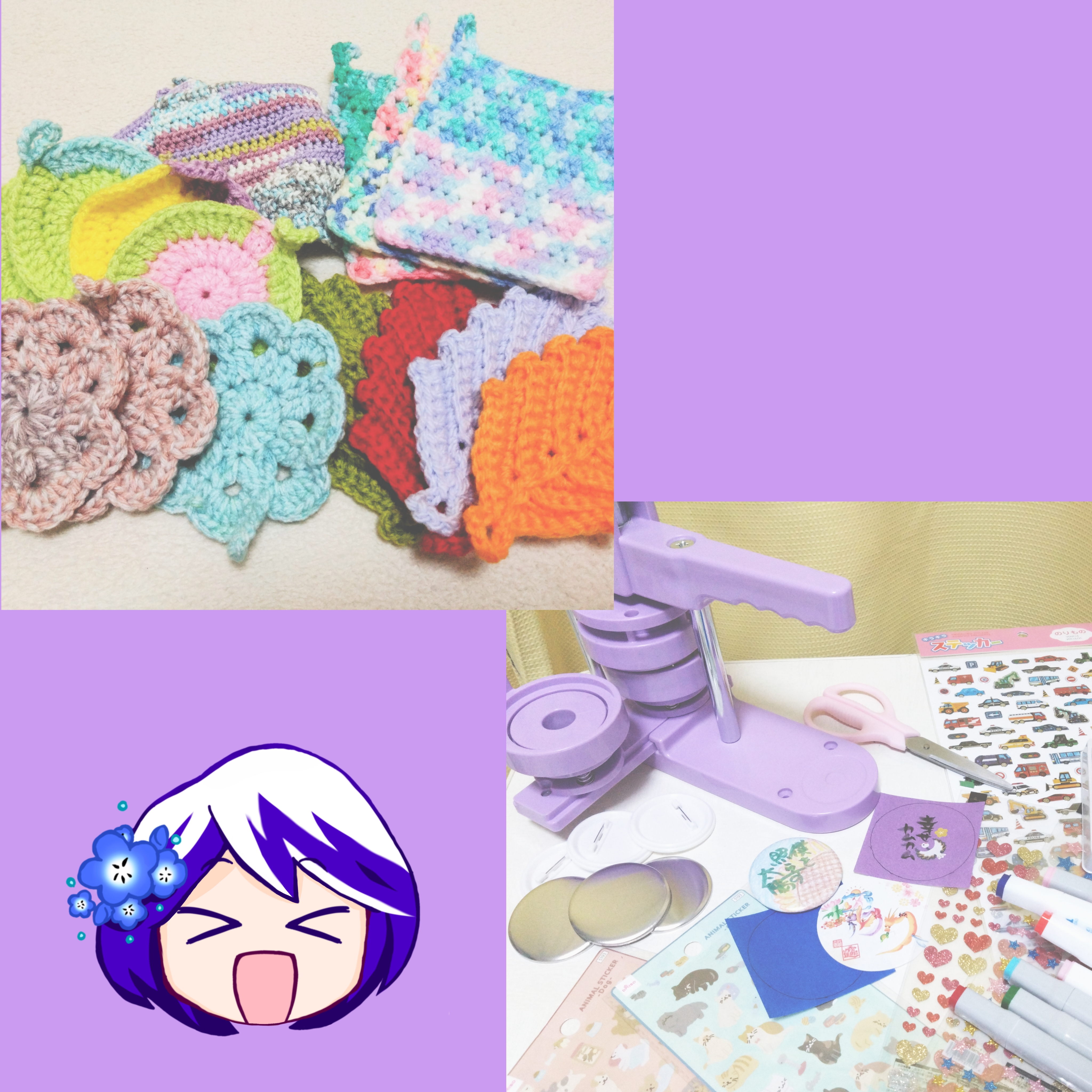 イベントは、手編みのアクリルたわしの販売や、缶バッジ作りのワークショップで出店することもあります。